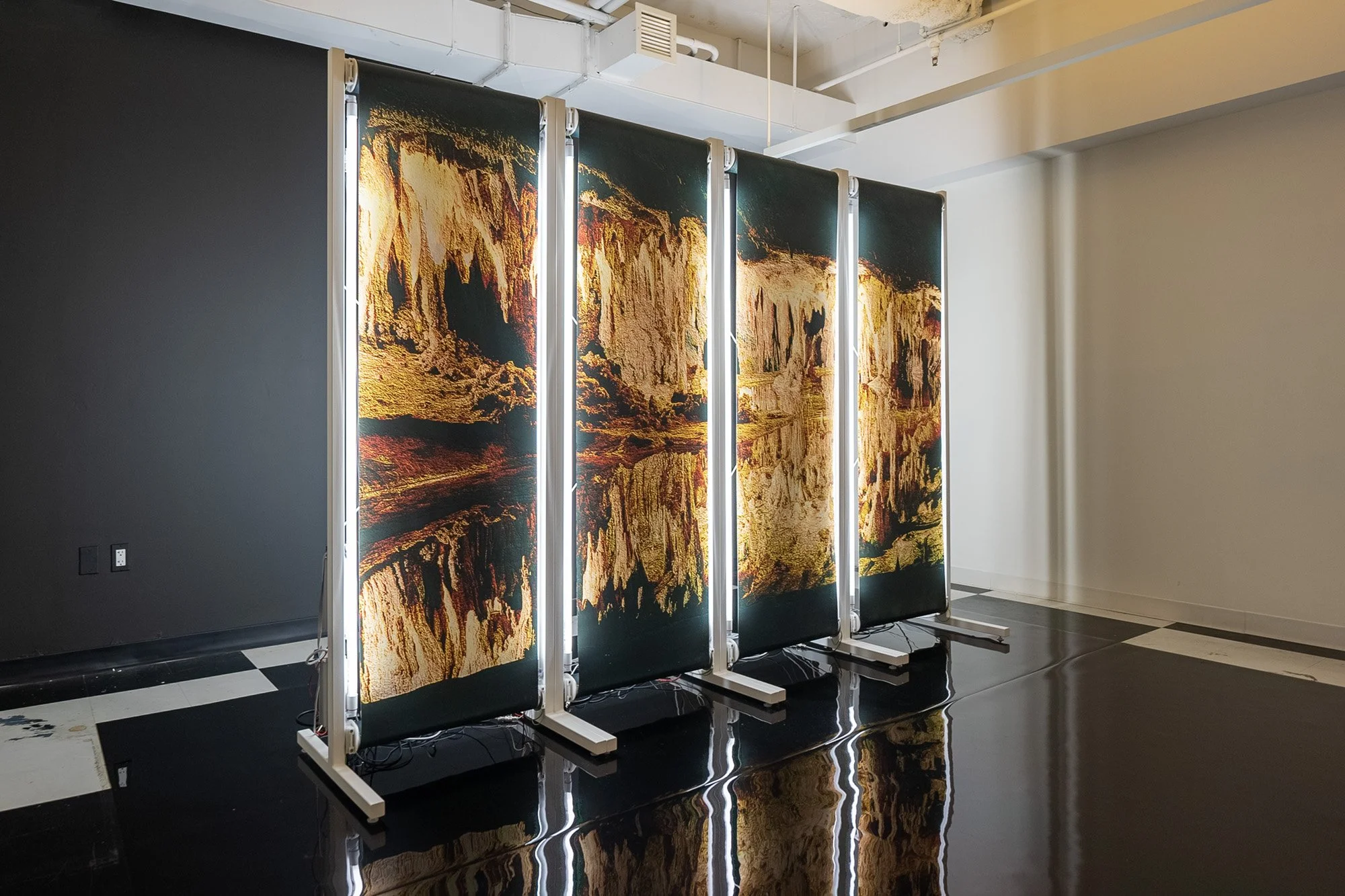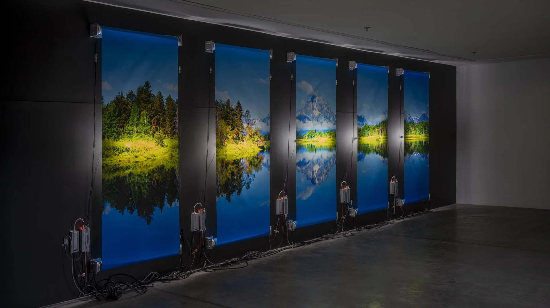2025 / 114”h x 152”w x 6”d Scrolling lightbox kits, electronic ballasts, Latex prints, 3 & 4 LED bulbs, speaker wire, power cords. Site-related installation