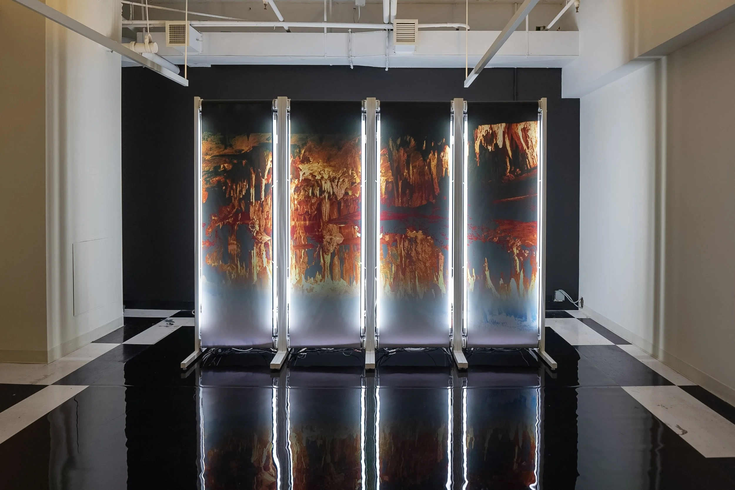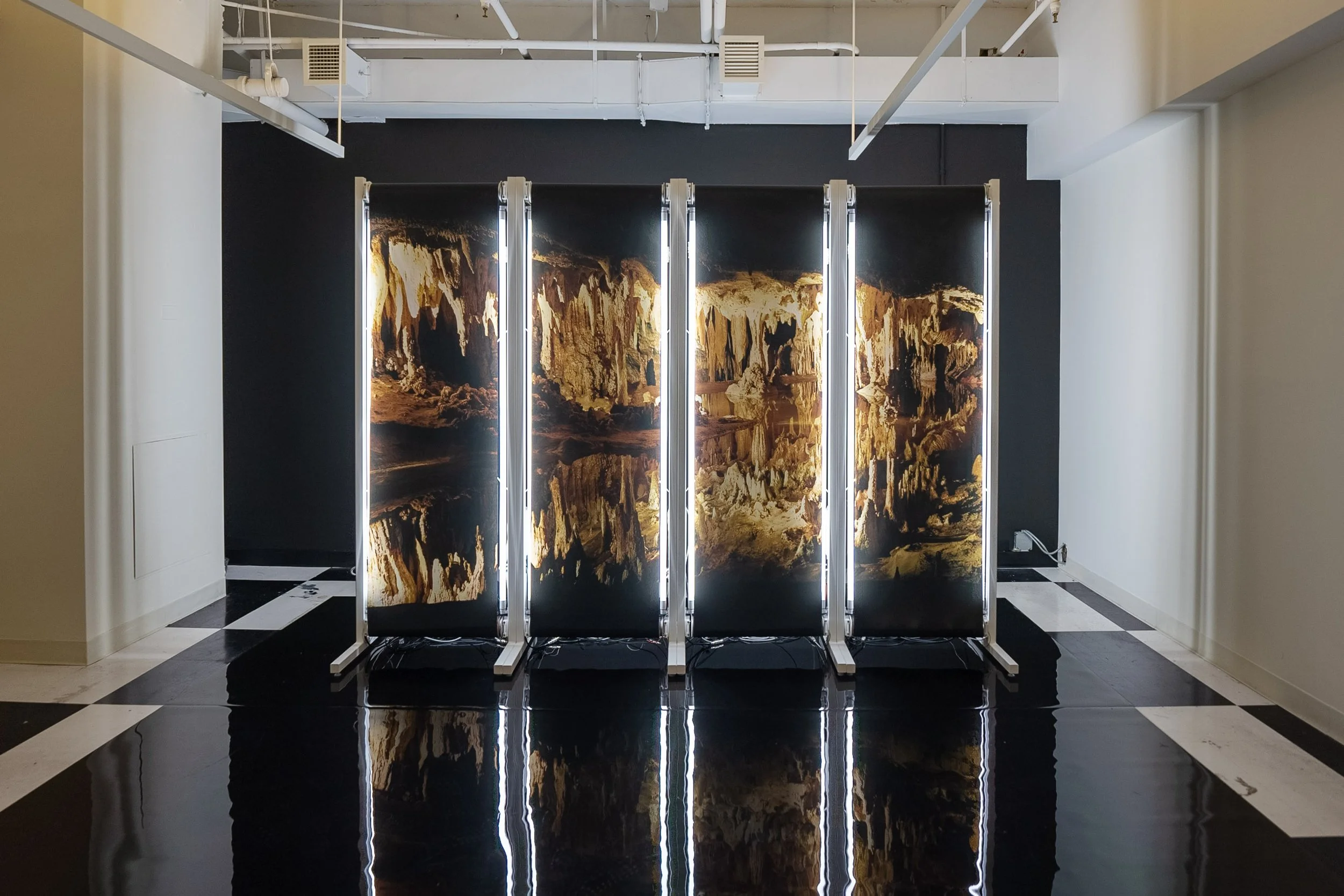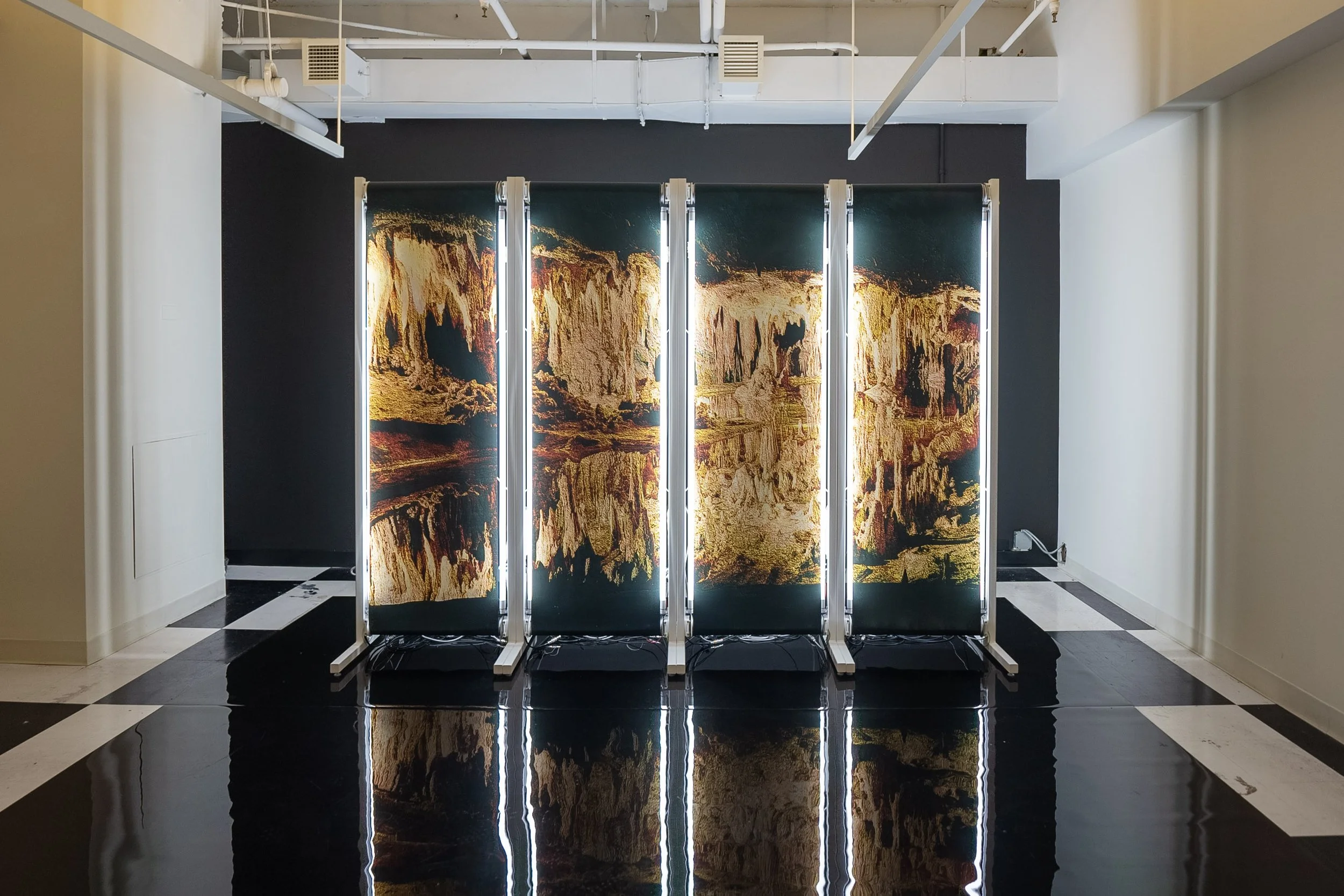 2025 / 348”h x 64”w x 6”d Scrolling lightbox kits, electronic ballasts, Latex prints, LED bulbs, speaker wire, power cords. Site-related installation
